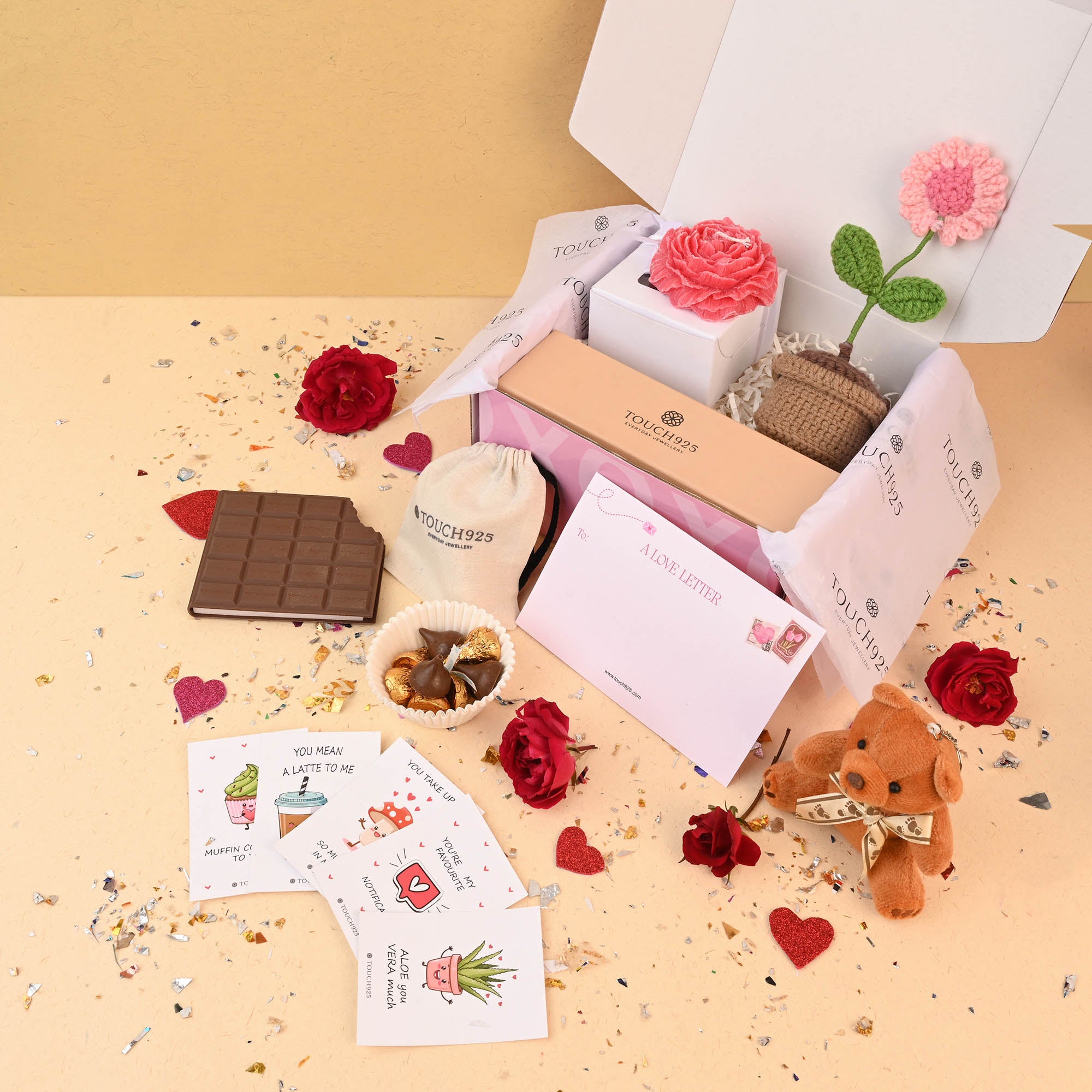 Make gifting effortless with our curated hampers! Each hamper contains the jewelry you’ve picked, along with a crochet flower, chocolate, candle, pun cards, postcard, mini diary, and cute keychain — all packed in a charming presentation. Perfect for her, your best friend, or a loved one, these hampers turn your Valentine’s gesture into a complete experience of love and fun.
