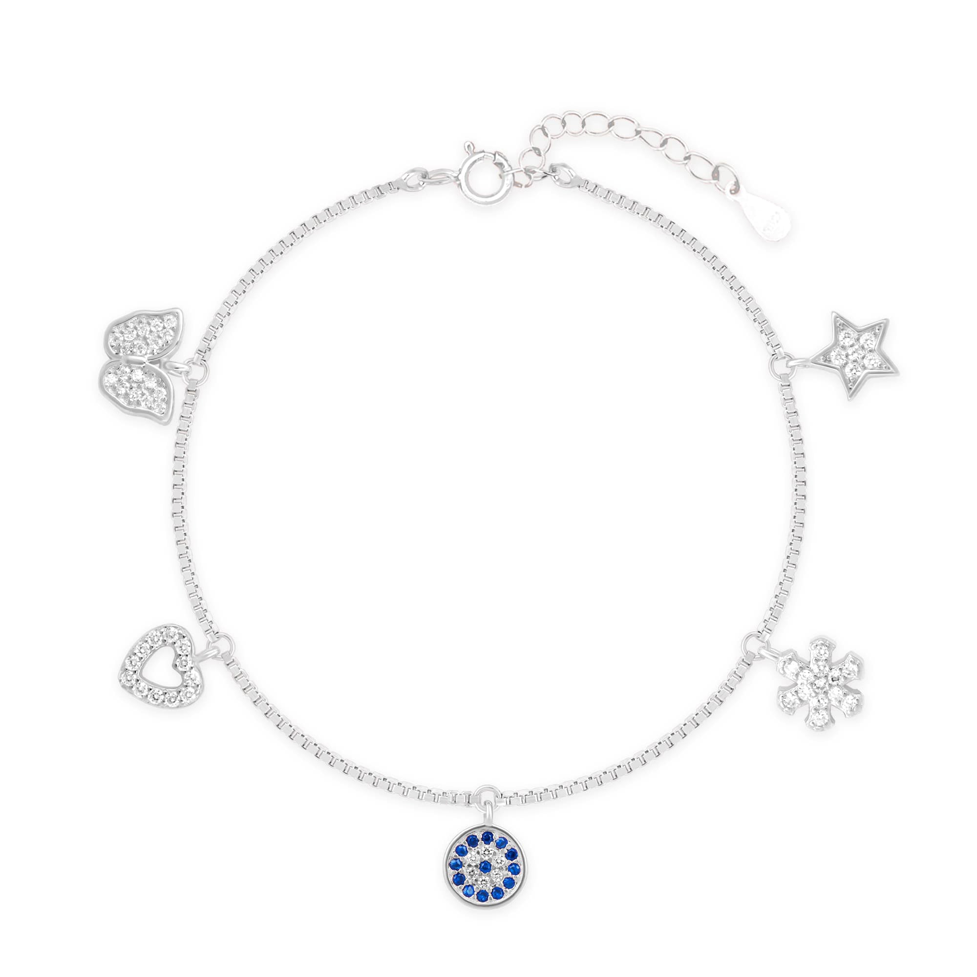 Stack it like you mean it — a silver bracelet for girls featuring playful charms brings that cool-girl energy to your everyday look. Feeling bold? Add an evil eye bracelet for a hint of mystique and major vibe protection. Crop tops, sneakers, denim — approved. Repeats? Inevitable.